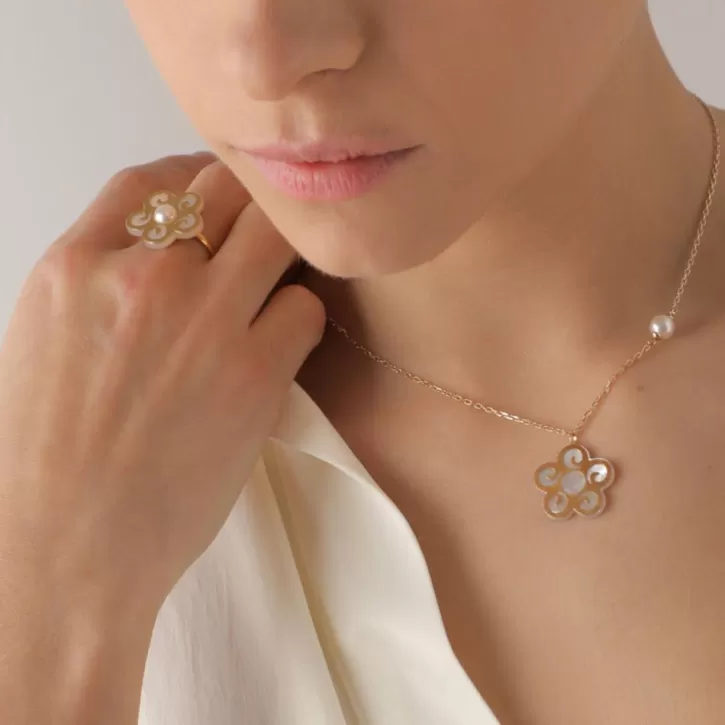 A Cheerful, Bold Ring Created From The Union Of The Mother-Of-Pearl And The Half-Ball Pearl That Crowns It. A Perfect Piece Whose Shape Will Give A Luminous, Feminine And Unique Air To Any Combination With Another Piece From The Roxana Collection.